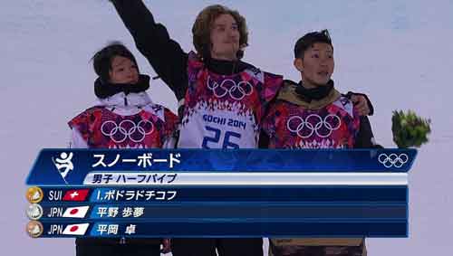 スイスのユーリ・ポドラドチコフ選手が94.75点で金、平野歩夢選手が93.50点で銀、平岡卓選手が92.25点で銅
