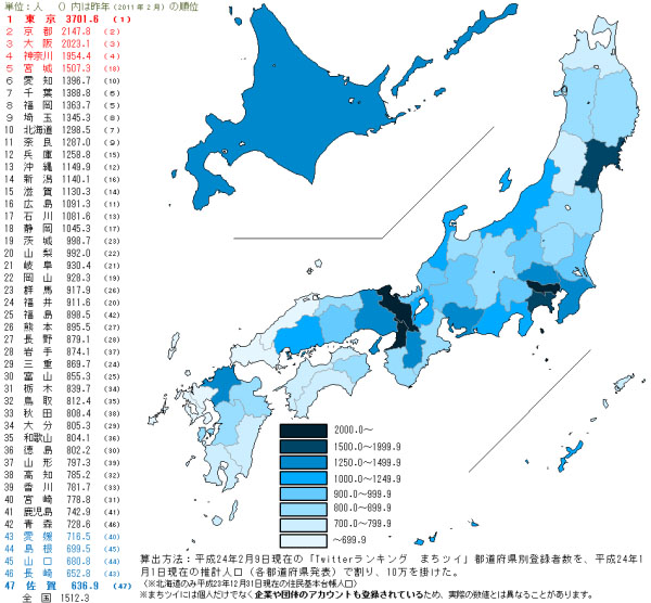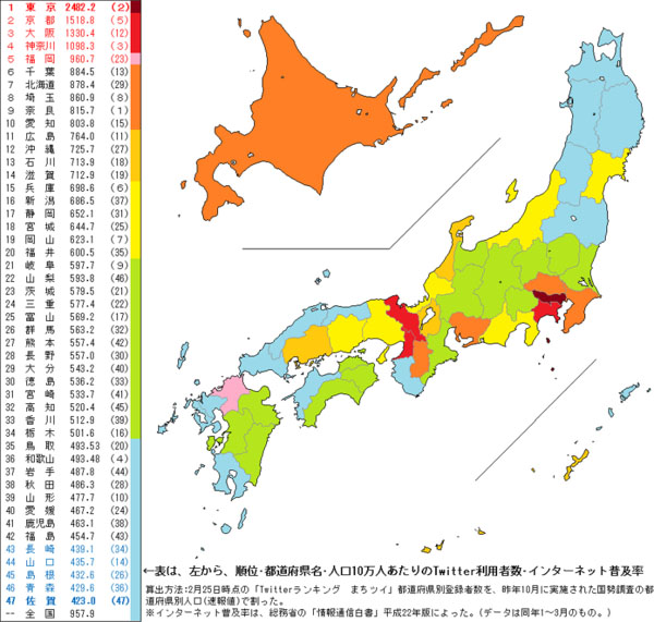 概ね人口に比例しているが、石川県の利用者の多さや、近畿圏のネット普及率の高さなど単純な人口比ではない点もある。山口県はネット普及率は14位なのにツイッターの普及率は低い。