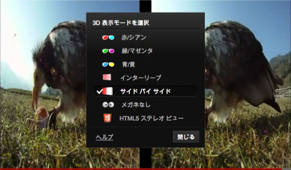 数年前からさりげなく3D動画に対応している YouTube が、1080p アップロード動画の自動2D - 3D 変換に対応しました。2D動画のワンクリック3D変換は昨年からベータとして導入されていた機能。Flash版プレーヤであれば、画質設定の歯車アイコンを押すと現れる3Dボタンから、色つきメガネやサイドバイサイドなど、さまざまな環境やデバイスにあわせた形式で3D表示が可能です。「メガネなし」を選べば交差法・平行法などの裸眼立体視もできます。