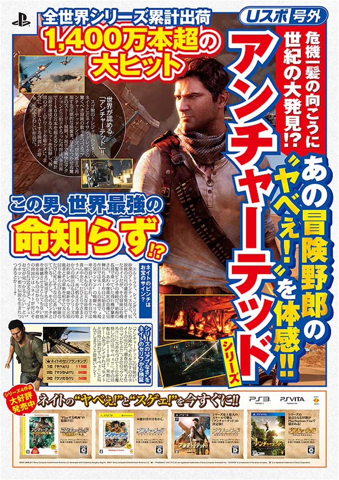秘境を冒険するアクション「アンチャーテッド」シリーズ(PS3・PSVITA)が全世界で累計1400万本出荷に到達した。