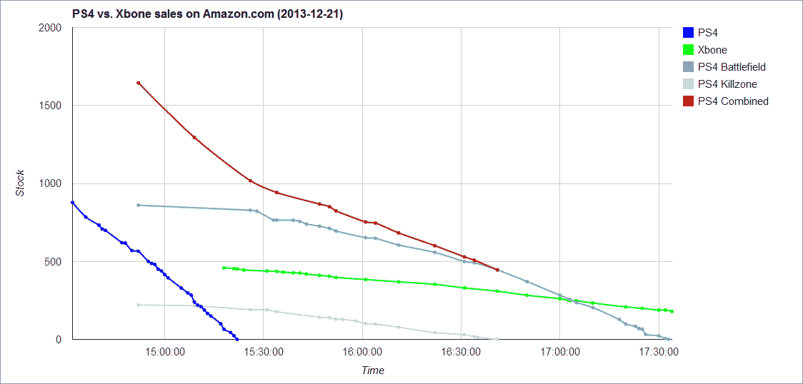 http://www.neogaf.com/forum/showthread.php?p=94352995赤いグラフがPS4本体合計値で約700台が販売、250台ほどのXB1に対しておよそ3倍の販売がこの時点で行われたことが推測される。