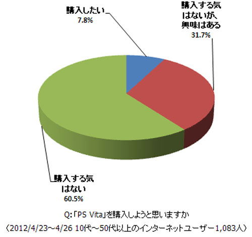 ・購入する気はない:60.5%(前回55.3%)(中略)PS Vita に対しては興味のある人がまだ3割いることから、新色や「初音ミク」とのコラボ製品といった新モデルの市場投入で消費者の関心を取り戻せるかもしれない。