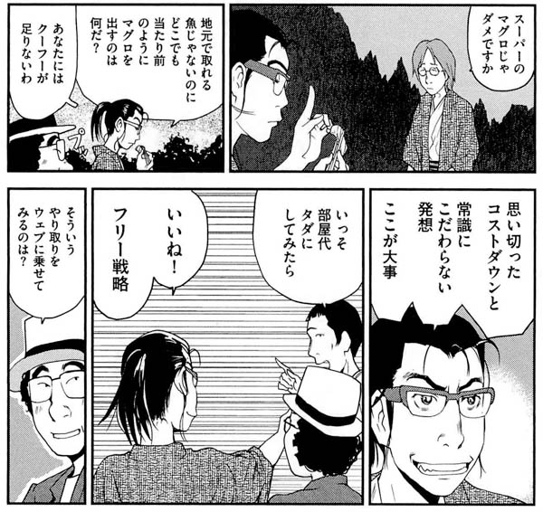 当初溝田は旅館を救うために、偶然訪れたネットアイドルあゆとそのファンをいかに長く滞在させるかを目標にしていたが、街中を巻き込んで「なんでも鑑定団」を模した生動画をWebで放送したり、田舎にありがちな地元の反発を、口先ひとつでうまく丸め込んでいく様が痛快だ。