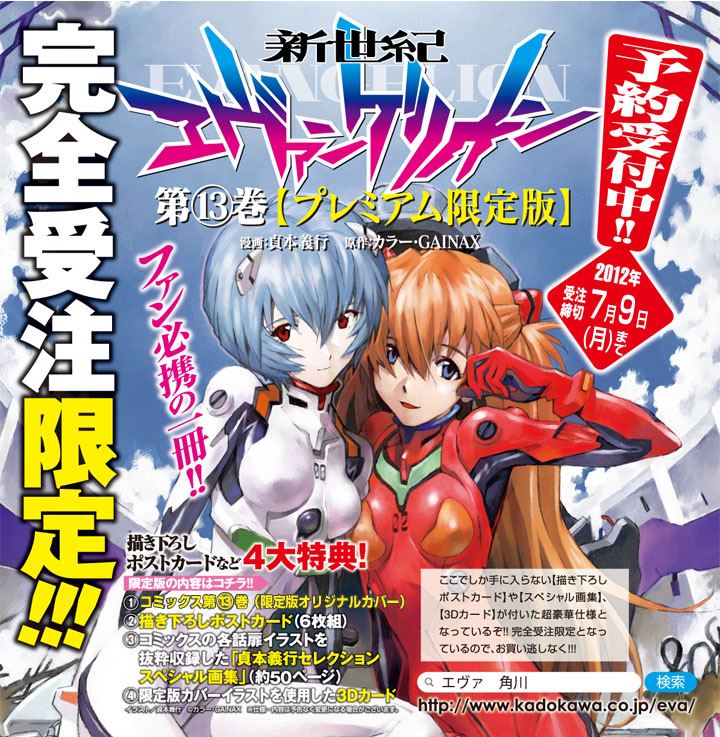 角川グループパブリッシングは、コミック『新世紀エヴァンゲリオン 第13巻プレミアム限定版』の受注を、7月23日まで延長する。当初は9日までだった。