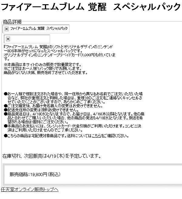 しかし、今回は『ファイアーエムブレム 覚醒』ソフトと3DS本体とセット販売の為、発売日にゲームを遊ぶには今予約しないと4月19日は間にあわないことになります。さらに数量限定販売の為、無くなり次第販売終了。アクセス集中の原因は、この2点が重なっていることが大きいと思われます。