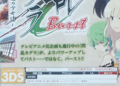 2012年4月28日~29日に千葉県の幕張メッセで開催されるイベント“ニコニコ超会議”のマーベラスAQLブースに、ニンテンドー3DS用ソフト『閃乱カグラ Burst -紅蓮の少女達-』(2012年8月30日発売予定)のコーナーが設けられることが決定した。ブースでは蛇女子学園メンバー5人の立看板がずらっとお出迎えし、さらに各キャラクターに押すとしゃべる秘密のボタンが付いている。喜多村英梨と原田ひとみのビデオメッセージがブースで初公開され、先着でオリジナルBOXティッシュ“僕の秘立蛇女紙”もプレゼント予定だ。