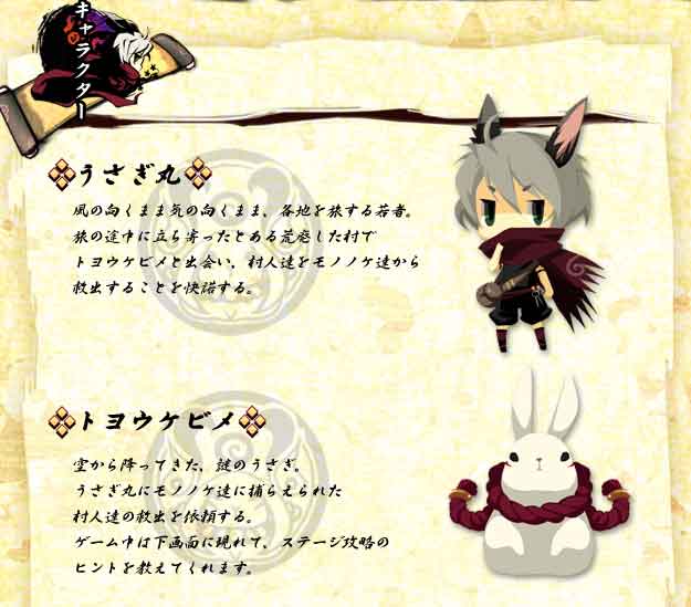 本作は,主人公「うさぎ丸」を操作して,謎の敵「モノノケ」に捕らえられた村人達を救出することが目的の2Dアクションパズルゲーム。見た目には,いわゆる横スクロールのジャンプアクションゲームだが,それぞれのステージにパズル的な要素が用意されているのが特徴だ。