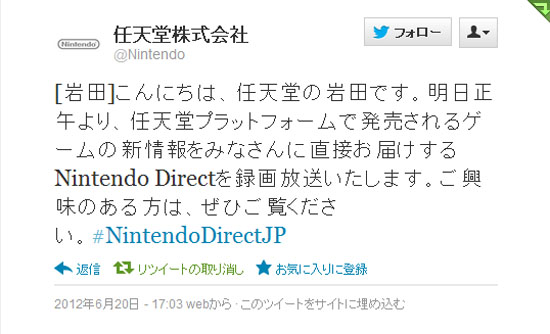 [岩田]こんにちは、任天堂の岩田です。明日正午より、任天堂プラットフォームで発売されるゲームの新情報をみなさんに直接お届けするNintendo Directを録画放送いたします。ご興味のある方は、ぜひご覧ください。