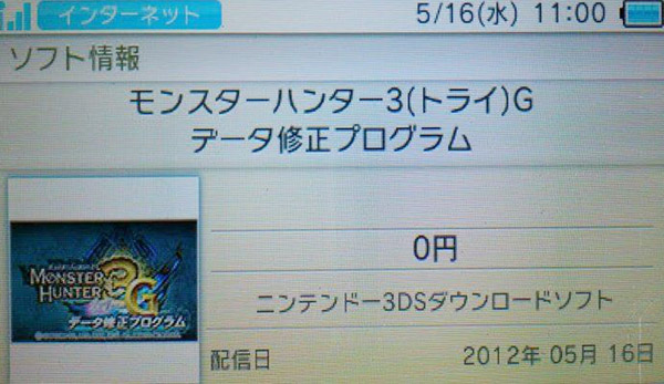 この修正プログラムによって、『モンスターハンター3(トライ)G』 で全ての闘技大会クエストを全武器でクリアした際に入手できる装備が、「希少交易」にて「団長船の強化材」を交換することにより、入手できなくなる不具合を修正することができます。