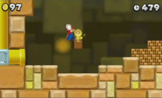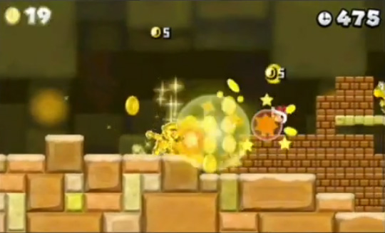 ゴールドマリオ:金色のフラワーを取ると変身でき、レンガブロックをコインに変えられる。