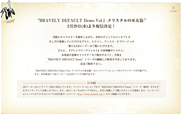 株式会社スクウェア・エニックスは、3DSソフト「BRAVELY DEFAULT(ブレイブリーデフォルト)」(2012年発売予定)の体験版、“Demo Vol.1 -クリスタルの巫女篇-”を、2012年2月29日(水)より、ニンテンドーeショップにて配信することを決定いたしました。