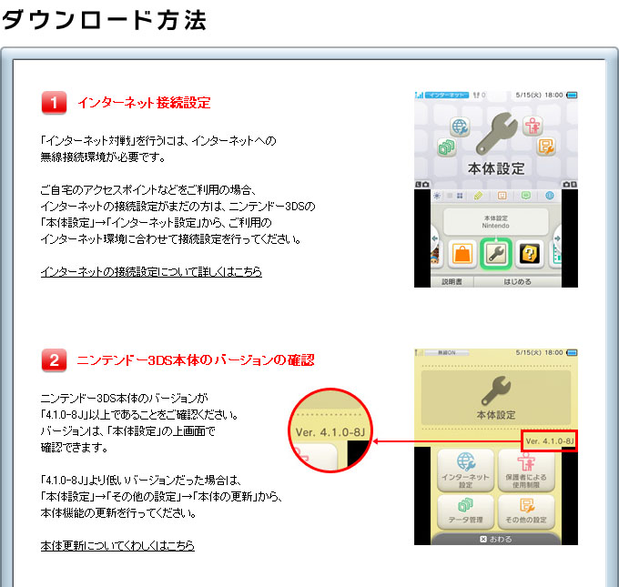 本体機能の更新は、3DS本体をインターネットに接続して、「本体設定」→「その他の設定」→「本体の更新」で行えます。