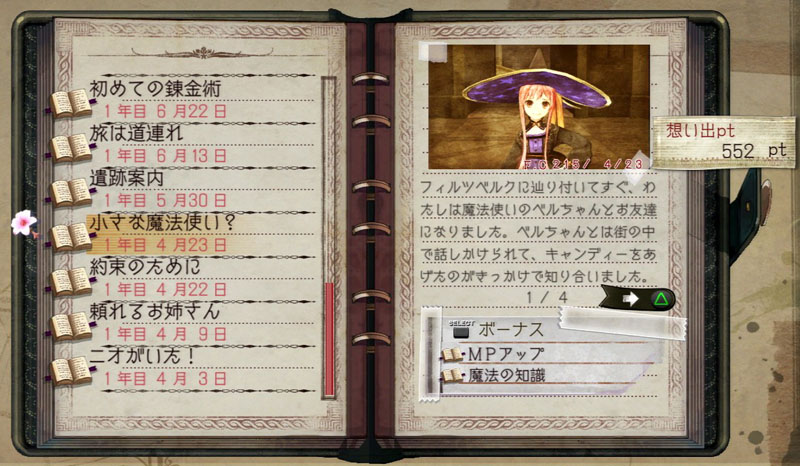 「想い出を紡ぐ」で獲得できるボーナスは重要なものが多い。フィールド移動時や採取時の日数経過を軽減してくれる冒険用アイテムのレシピは,早めに手に入れておきたい