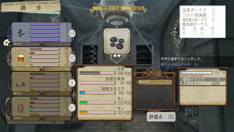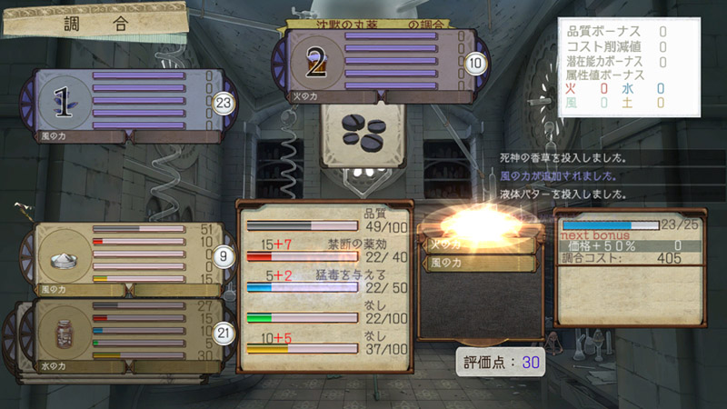 ▲材料の投入画面 左側に素材ごとの品質・属性(火水風土)、中央に調合後の反映値が表示される
