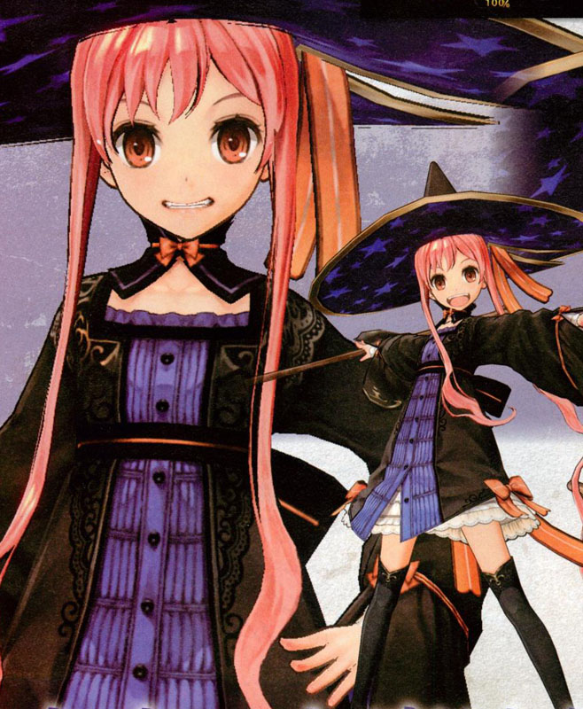 赤みがかったピンクのロングヘアをアップにしてもみあげ部分のみ前に垂らし、頭には鍔広のとんがり帽子を被っっている少女。服装はゴスロリっぽい魔法少女風衣装に箒を手にしている。