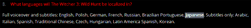 GOG.comの商品ページに掲載されたFAQから、“The Witcher 3: Wild Hunt”が吹き替えと字幕を含む日本語対応を果たすことが判明しています。 http://doope.jp/2014/0634254.html