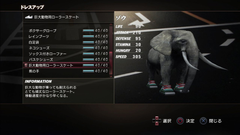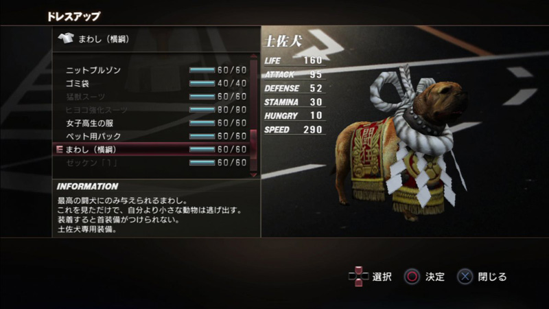 コスチュームはゲーム中のサバイバルポイントでも購入でき、様々な効果を持っている。また以下の土佐犬の横綱まわしなど各動物専用のコスチュームもある。
