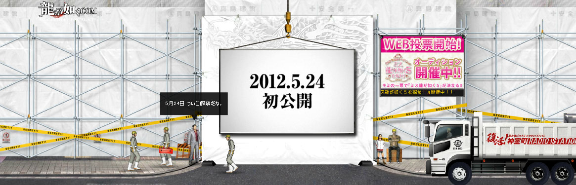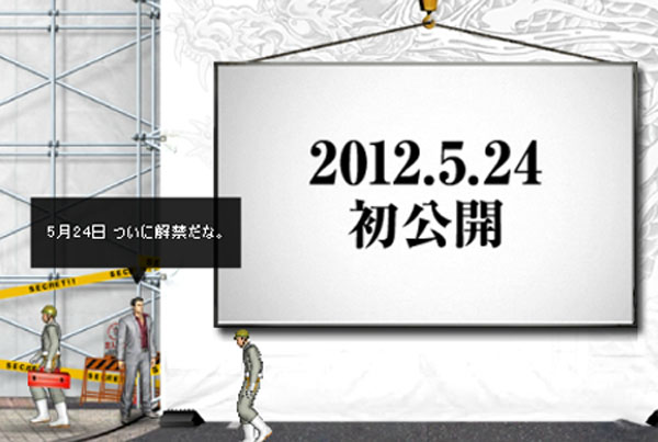 Flashは工事中のビルを背景に,クレーンによってスクリーンがつり下げられている,という作りで,そこで「龍が如く」第1作から「龍が如く4」までのロゴとキャッチコピーが順番に流れている。そしてその最後には「2012.5.24初公開」の文字が。どうやら,5月24日にシリーズ作品に関するなんらかの発表があるようだ。