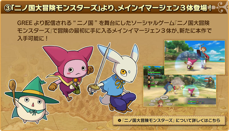 「GREE」より配信される「二ノ国」を舞台にしたソーシャルゲーム「二ノ国大冒険モンスターズ」で冒険の最初に手に入るメインイマージェン3体が、新たに本作で入手可能に!