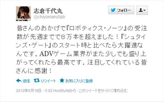 皆さんのおかげで『ロボティクス・ノーツ』の受注数が先週までで8万本を超えました!『シュタインズ・ゲート』のスタート時と比べたら大躍進なんです。ADVゲーム業界がまた少しでも盛り上がってくれたら最高です。注目してくれている皆さんに感謝!