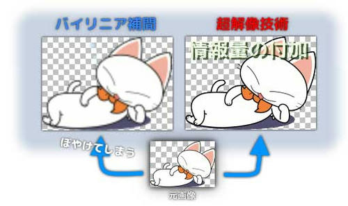 単純な拡大ではボケやジャギーが出るために情報を付加する技術を採用