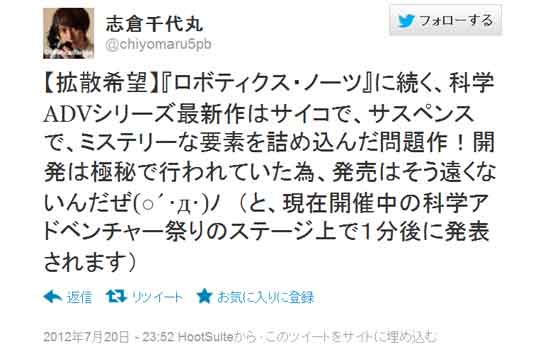 2012年7月21日、東京・秋葉原のベルサール秋葉原にて開催されたイベント“科学アドベンチャー祭り 2012SUMMER”。同イベント内“科学アドベンチャーシリーズトークイベント”で、『カオスヘッド』、『シュタインズ・ゲート』、『ロボティクス・ノーツ』に続く、“科学アドベンチャー”シリーズの新作が制作されることが発表された。会場では、渋谷の街並みを描いたビジュアルが1点公開されただけにとどまった
