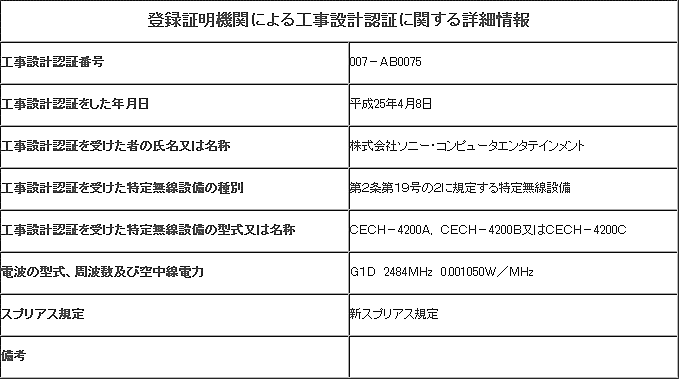 技術基準適合証明(ぎじゅつきじゅんてきごうしょうめい)とは、3つの型番はHDDの容量違いだと思われる。現行のPS3はCECH-4000A/B/Cの3機種で保存容量が12GBフラッシュ/HDD250GB/500GBと分かれている。