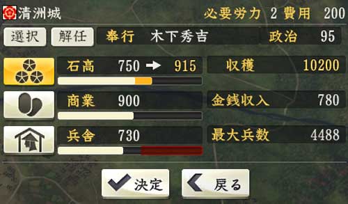 兵舎の最大値は石高の制限を受けるため、際限なく増やすことはできません。