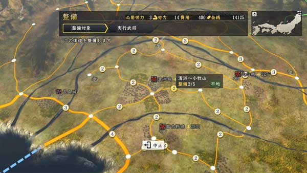 ▲街道の整備数値が大きいほど兵士の円滑な移動と、人口が増えやすくなる利点がある。
