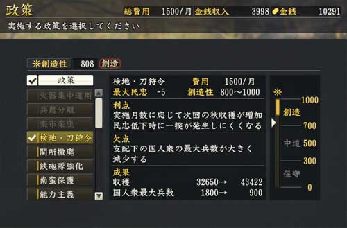 右側の大名家の「創造性」の傾向によって「兵農分離」や「楽市楽座」などが採用できる