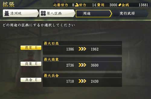 この上限も城下町に「建設」で施設を作ったり、さらに区画を「拡張」することで増加していく
