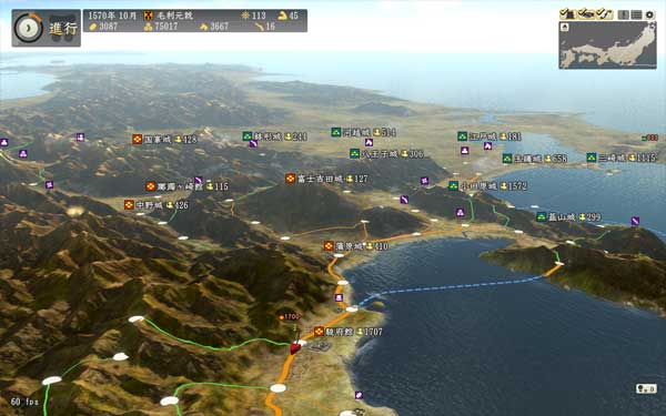 このベンチマークデモは,現在使っているPCが,本作をプレイするためのスペックを満たしているか,どの程度快適に動作するかを確認するためのソフトだ。オープニングムービーが流れた後にベンチマークをスタートすると,ゲームプレイを模したデモプレイが自動で進み,プレイヤーはマウス操作によるマップの移動,拡大/縮小,拠点や出撃している部隊の確認,表示情報のオン/オフといった操作ができる。また,ときおり合戦に場面転換し,その様子も確認可能だ。どれもプレイヤーは状況に介入できない(※進行速度の変更や合戦シーンの終了は可能)が,ゲーム中の雰囲気が分かるものとなっているので,PCの準備万端というプレイヤーも一度起動してみるといいだろう。