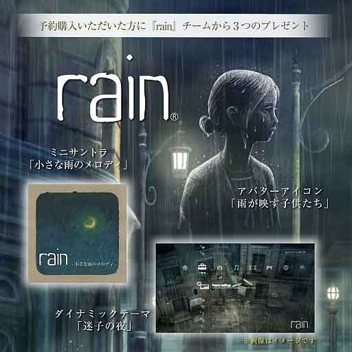 ソニー・コンピュータエンタテインメントジャパンアジアは本日(2013年8月22日),“迷子”をテーマにしたアクションアドベンチャー「rain」の発売日が,2013年10月3日に決定したと発表した。価格は1500円(税込)で,ダウンロード販売のみとなる。また発売に先駆けて,PlayStation Storeにて3つの特典がもらえる予約キャンペーンが,2013年9月19日から9月30日まで実施される。