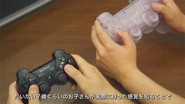 ▲1.5倍のサイズのデュアルショック3を3Dプリンターで作成し、手の小さい子供たちのプレイ感を再現したそうだ