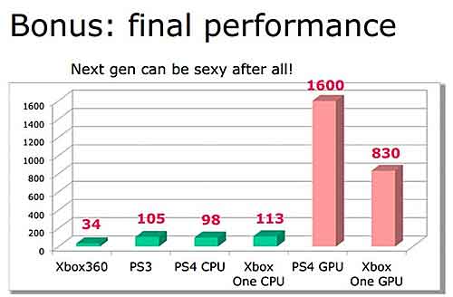 下のベンチマークにある通り、Xbox OneはかろうじてPS3を上回ったが、信じられないことにPS4はPS3を下回っている。(MSがおそらくはギリギリで行ったCPUのオーバークロックの原因となっている可能性がある)。