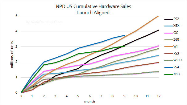 米市場で発売から9ヶ月までの累計が判明し、PS4とWiiが並んだ。