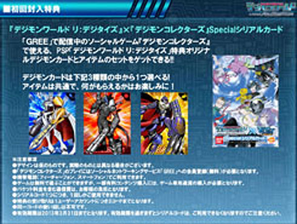 「GREE」で配信中のソーシャルゲーム『デジモンコレクターズ』で使える特典オリジナルデジモンカードとアイテムのセットをゲットできちゃいます!デジモンカードは3種類の中から1つ選べるんですよ~。