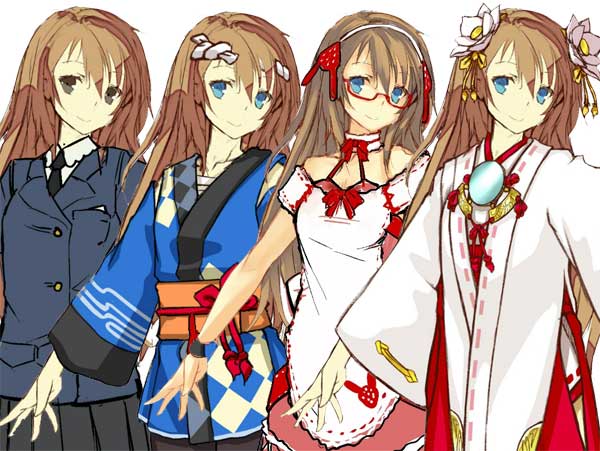 左から「メモリア」、「水松法被+ねじり鉢巻」、「カフェットエプロン+ラビットカチューシャ」、「水鏡+蓮花[初回特典]」