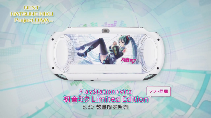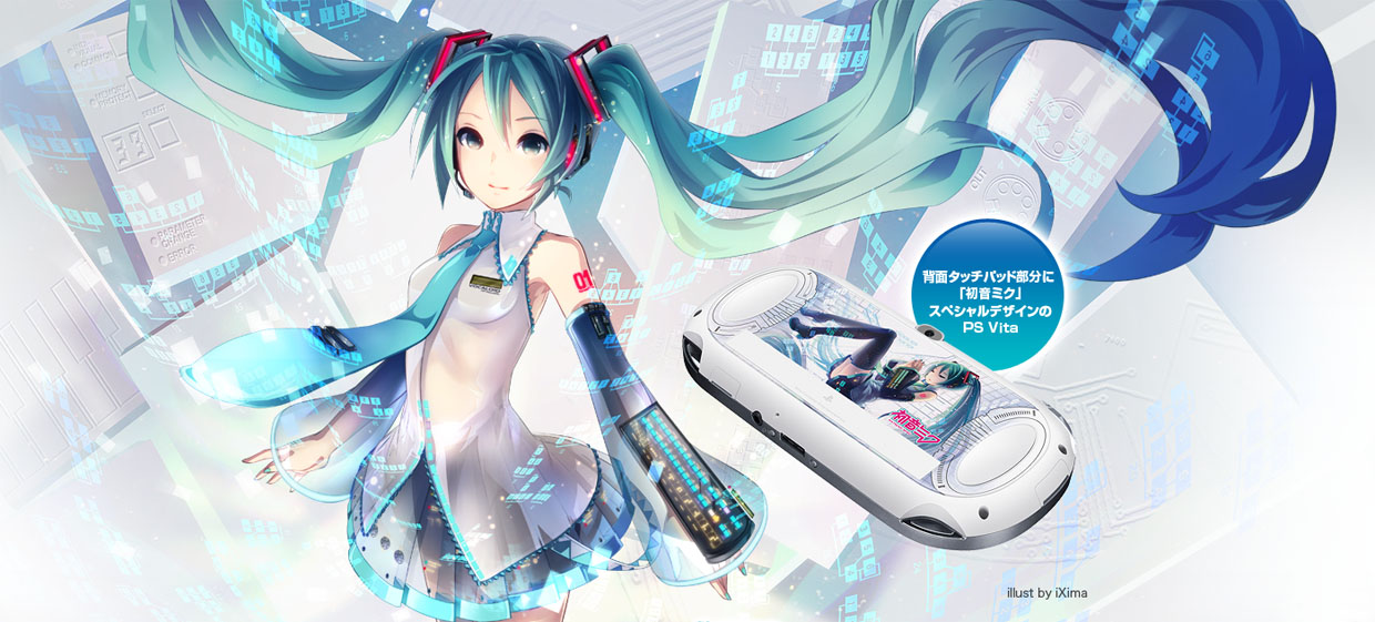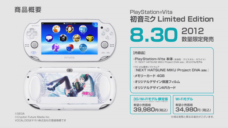 PS Vitaクリスタル・ホワイトをベースに 背面タッチパッド部分に「初音ミク」スペシャルデザインのPS Vita本体と PS Vita専用ソフトウェア『NEXT HATSUNE MIKU Project DIVA(仮称)』 およびセーブデータや追加コンテンツの保存に使用する※ 「メモリーカード 4GB」がセットになった数量限定モデルです。 初音ミクモデル 特設サイト