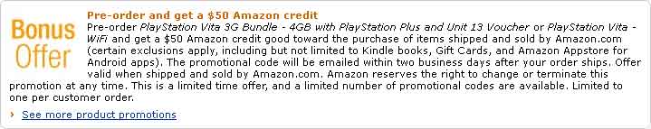 北米のアマゾンでPSVitaは販売価格が299.68ドル、価格は日本の改定前と同じ水準だがPS+加入権や4GBのメモカなどおまけオプションが豪華だ。