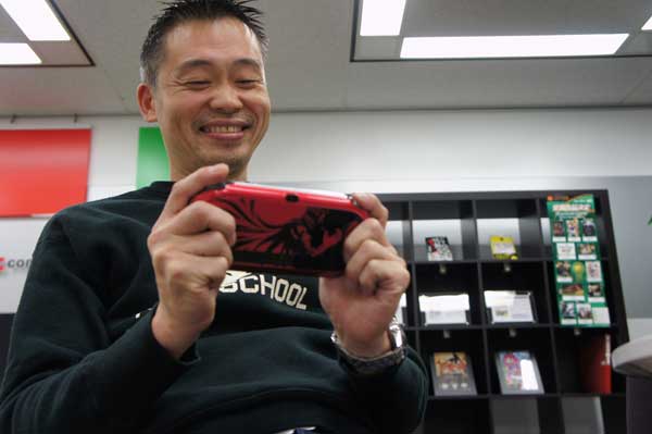 「PREMIUM EDITION」に同梱されるオリジナルデザインのPS Vitaで、体験版の最終チェックをする『ソルサク』コンセプター稲船さん。魔法使いのイラストがプリントされた真っ赤なPS Vitaを手に、ご満悦の表情です。