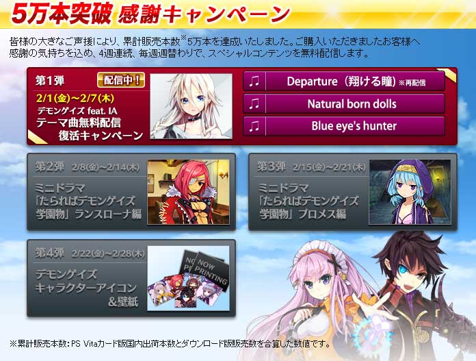 ご購入頂きましたお客様への感謝の気持ちを込め、本日より4週連続の「5万本突破 感謝キャンペーン」を実施いたします。『デモンゲイズ』公式サイトにて、本日より4週連続、毎週週替わりでデモンゲイズのスペシャルコンテンツを一挙無料配信いたします。