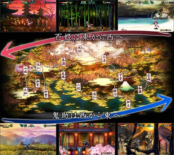 物語の舞台は元禄時代の本州、将軍徳川綱吉の治世。主人公を選択し、鬼助は西から東へ、百姫は東から西へ、それぞれのルートで行く手を阻むさまざまな敵と戦いながら進んでいく。道中、都や村などでは人々から情報を集められるほか、回復のための薬や食べ物、装飾品などを購入することもできる。