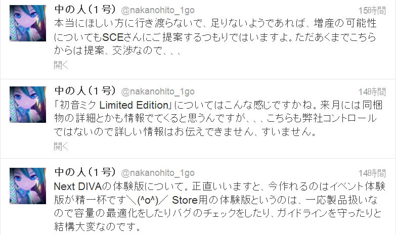 Project DIVA 担当者:“中の人1号”のツイッターにてミクVITAについて語られている。