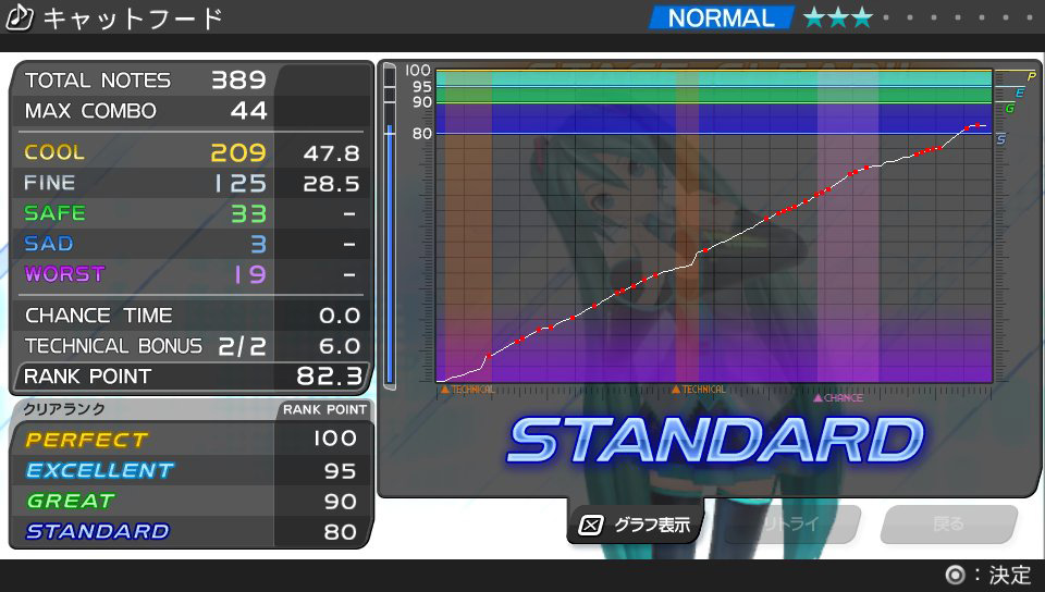 規定のフレーズにおいてコンボを完全につなげることで、ボーナス点が加算されます。より高いクリアランクを目指すには「テクニカルゾーン」の攻略が必須となるでしょう。難易度は従来通りの4段階、評価もシリーズの伝統を引き継いでいますが、細かいところまで調整し直されています。