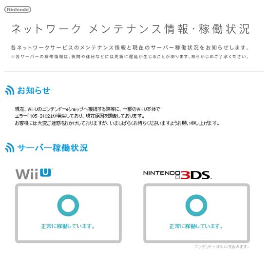 現在、Wii Uのニンテンドーeショップへ接続する際などに、一部のWii U本体で エラー「105-3102」が発生しており、現在原因を調査しております。 お客様には大変ご迷惑をおかけしておりますが、いましばらくお待ちくださいますようお願い申し上げます。