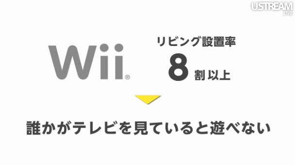▲Wiiはリビング設置率が8割以上と高く、WiiUコンでプレイする事で同時にテレビを見ることも可能に。