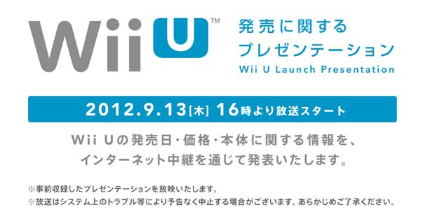 [岩田]こんばんは、任天堂の岩田です。明日13日木曜日の16時より、「Wii U発売に関するプレゼンテーション」をインターネットで放映いたします。Wii U本体の価格や発売日などの情報を発表させていただきます。#NintendoDirectJP