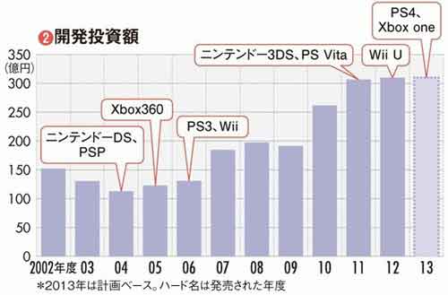 他方、複数のハードにソフトを供給するのは、開発投資額の高騰が背景にある(図(2))。プレイステーション(PS)3やマイクロソフトの Xbox360の発売で、高精細な画像や処理スピードなどが求められ、開発投資額が150億円規模から今では300億円規模に膨らんでいる。
